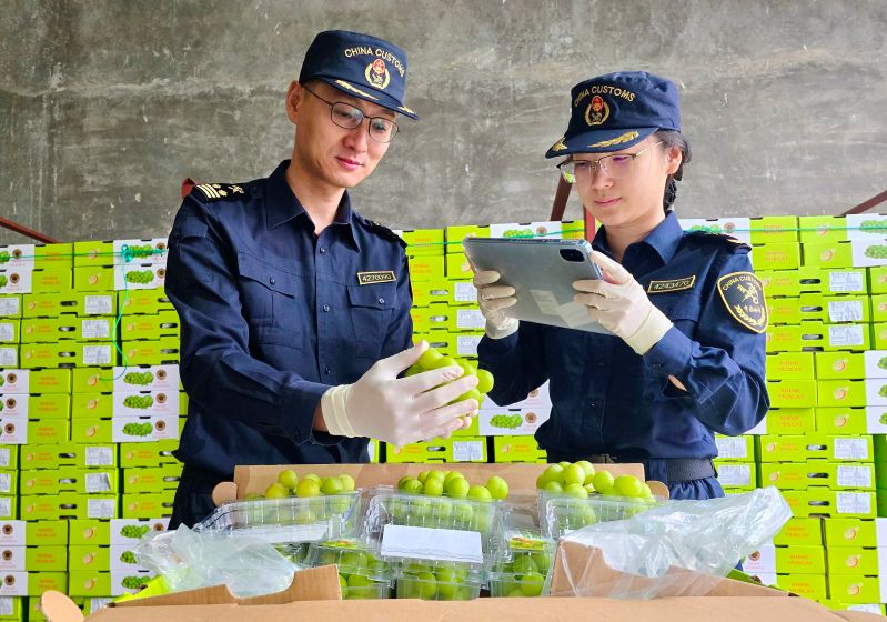 圖為:海關(guān)關(guān)員對(duì)葡萄進(jìn)行現(xiàn)場(chǎng)查驗(yàn) 張明艷/攝