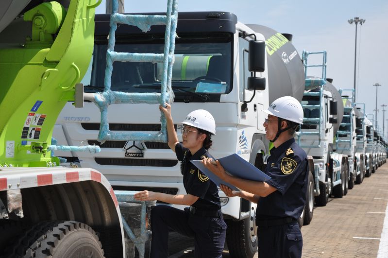 圖為:海關(guān)關(guān)員現(xiàn)場(chǎng)監(jiān)管查驗(yàn)出口幾內(nèi)亞工程車輛 蔡子揚(yáng)/攝