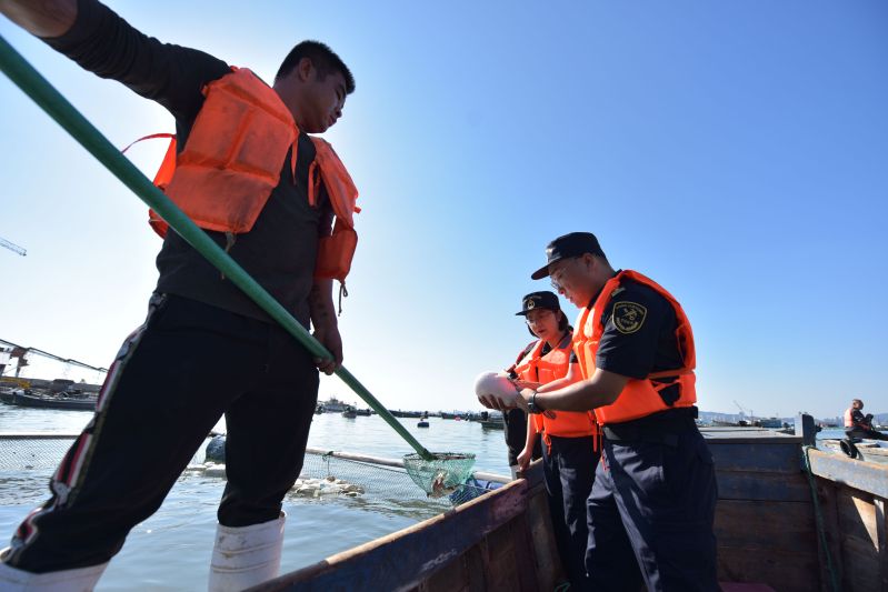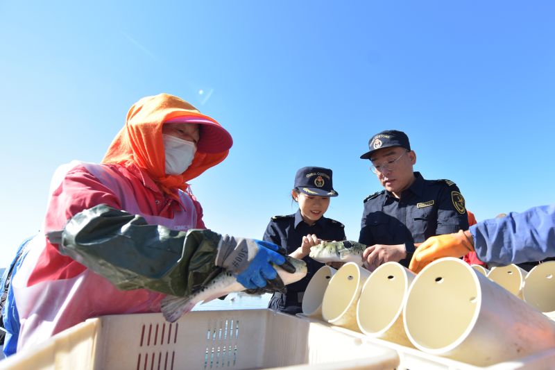 每年的9至11月份是河鲀出口旺季。9月23日,在山東煙臺芝罘島海邊,煙臺聚隆水產(chǎn)有限公司養(yǎng)殖的2300尾鮮活河鲀陸續(xù)被打撈、稱重、裝入筒中,青島海關(guān)所屬煙臺海關(guān)關(guān)員正在對出口河鲀實施現(xiàn)場監(jiān)管,經(jīng)檢驗檢疫合格后,這批河鲀將被裝入活魚專用集裝箱,啟程發(fā)往韓國。