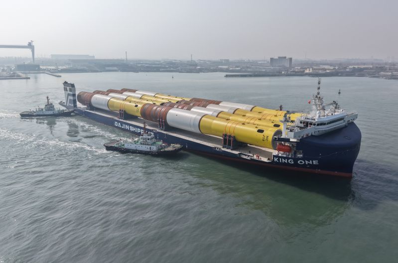 近日,在海關(guān)監(jiān)管保障下,4萬噸甲板運(yùn)輸船KING ONE輪在大金蓬萊海工基地首航,裝載8根大型風(fēng)電單樁駛往歐洲。