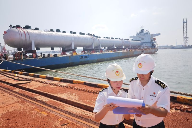9月1日,在青島海關(guān)所屬蓬萊海關(guān)關(guān)員現(xiàn)場(chǎng)監(jiān)管下,三臺(tái)超大型高壓反應(yīng)釜順利裝至“泛舟6”號(hào)半潛船上,將運(yùn)往印度尼西亞。