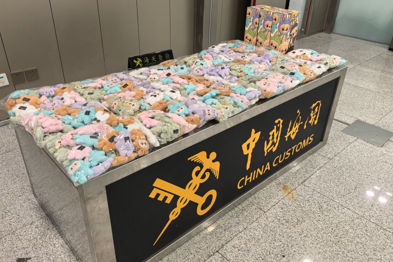 青島膠東機(jī)場(chǎng)海關(guān)查獲攜帶入境侵權(quán)“LABUBU”產(chǎn)品483件(圖)