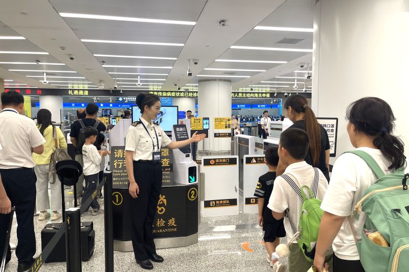 圖為:海關(guān)關(guān)員在引導(dǎo)旅客有序通關(guān) 曹琳/攝