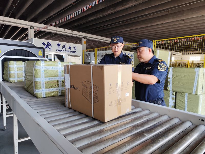 圖為:關(guān)員現(xiàn)場檢查跨境電商出口貨物(林海洋/攝)