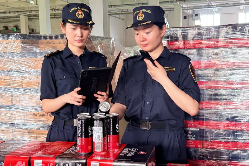 圖為:海關(guān)關(guān)員對(duì)進(jìn)口啤酒實(shí)施現(xiàn)場(chǎng)查驗(yàn) 姜明/攝