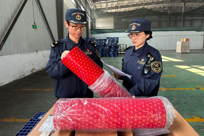 圖為:海關(guān)關(guān)員查獲侵權(quán)雙面膠帶 劉魯豫/攝