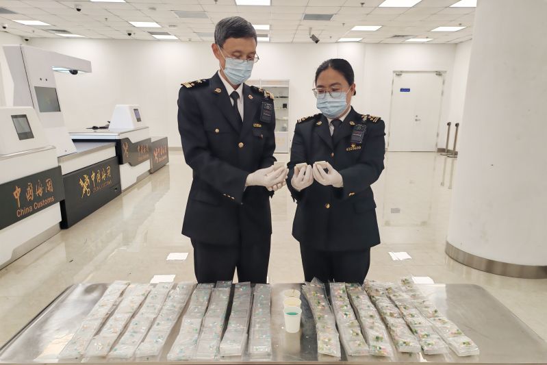 海關(guān)關(guān)員在對入境航班進行監(jiān)管時,發(fā)現(xiàn)一名選擇“無申報通道”入境的旅客行李機檢圖像異常。經(jīng)開包查驗,查獲未向海關(guān)申報的“三無”減肥產(chǎn)品416包,共計2792粒,經(jīng)現(xiàn)場快速檢測,產(chǎn)品呈甲基安非他明陽性。