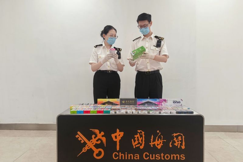 圖為:海關(guān)關(guān)員查獲違規(guī)攜帶進(jìn)境卷煙、電子煙及電子煙具 高峰/攝